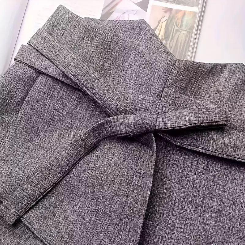 # Material: Premium blended fabric (can be adjusted to linen-cotton, polyester, etc., based on actual material) # Color: Heather Grey # Design: Asymmetrical hem, wide waist belt, tie closure #Size: One size (adjustable tie, fits waist 60–90cm) # Style: French retro, office style, minimalist sophistication # Applicable Scenarios: Daily wear, commuting, dating, parties # Matching Suggestions: T-shirts, dresses, blouses, blazers # Function: Cinch waist for a slimmer look, elevate waistline, add outfit layers